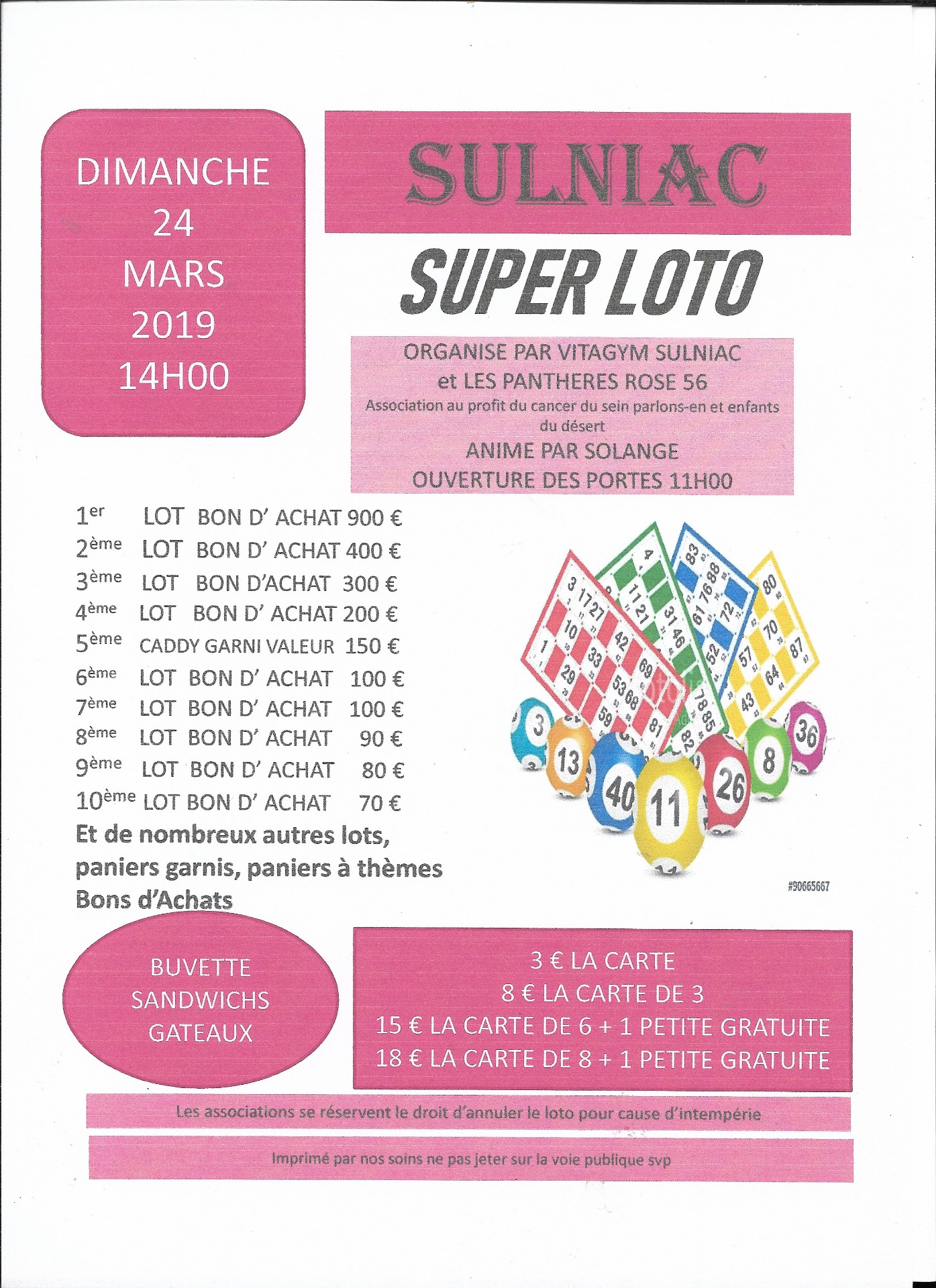 Notre association "Les Panthères Roses 56" s'associe à Vitagym Sulniac pour l'organisation du Loto du 24 mars 2019 à Sulniac, une partie des fonds seront reversés au Trek au profit des associations du CANCER DU SEIN PARLONS-EN et ENFANTS DU DESERT.
